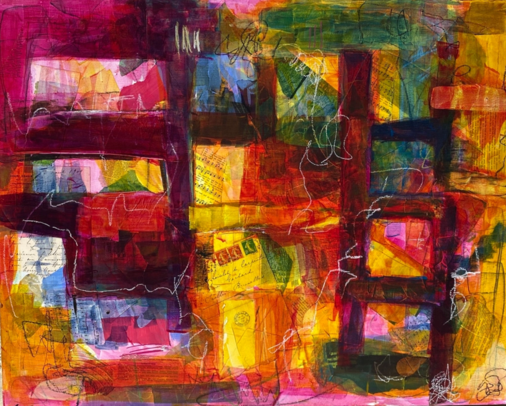 This series has evolved from an exploration of creating multiple layers with paint, collage, pencils, and markers. As I create each new layer, I then uncover the layers below. This back and forth, add and subtract goes on and on…until something hidden emerges.